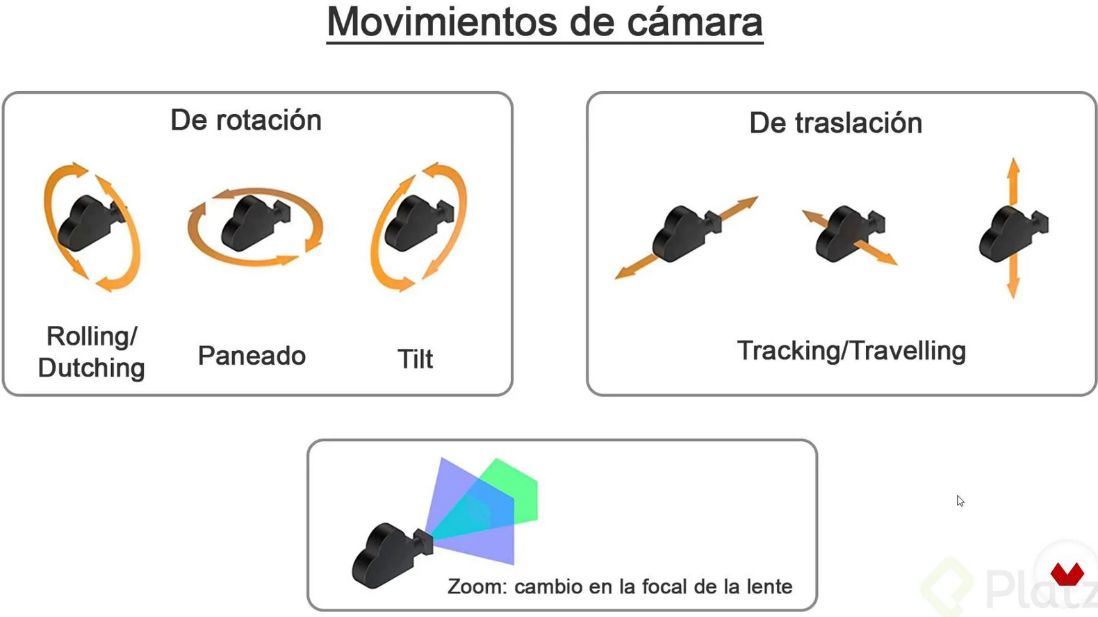 Como hemos visto los planos y sus ángulos son elementos que construyen las escenas, ahora la cámara es un importante objeto que tiene movimientos que pueden ser hechos durante la toma o mediante edición. Los podemos clasificar en: